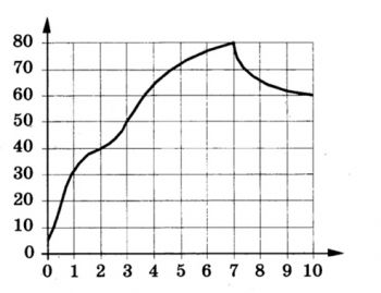 На графике показана зависимость температуры двигателя от времени в процессе разогрева двигателя легкового автомобиля. На оси абсцисс откладывается время в минутах, прошедшее смомента запуска двигателя, на оси ординат - температура двигателя в градусах Цельсия. Определите по графику,на сколько градусов Цельсия нагреется двигатель со второй по седьмую минуту разогрева.