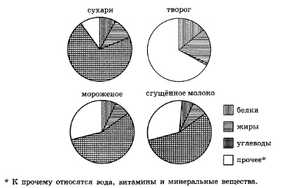 На диаграмме показано содержание питательных веществ в сливочных сухарях, твороге, сливочном мороженом и сгущённом молоке. Определите по диаграмме, в каком продукте содержание белков наименьшее.